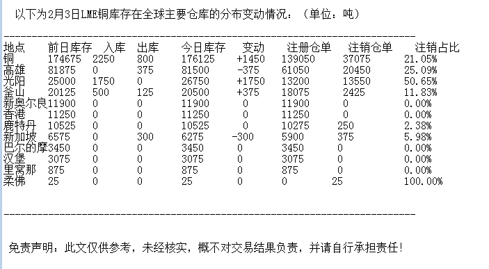 LME 2月3日铜库存分布情况